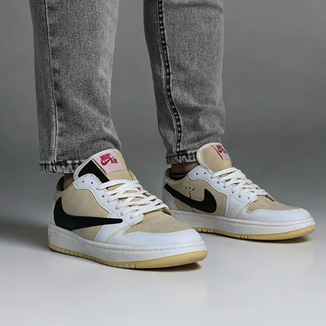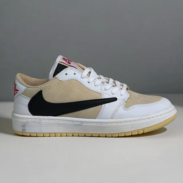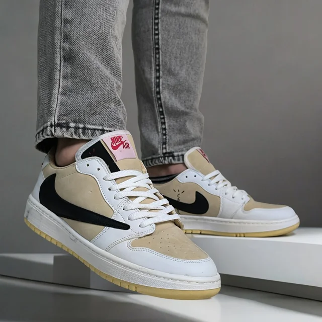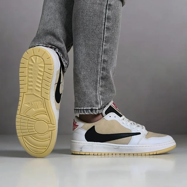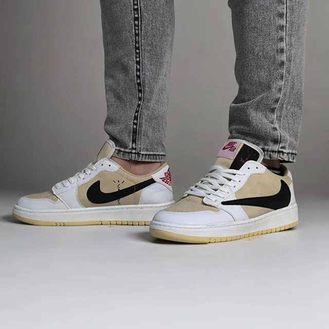 نایک ایر جردن 1 بدون ساق تراویس اسکات سفید خردلی ( Nike Air Jordan 1 Low Travis Scott WY)